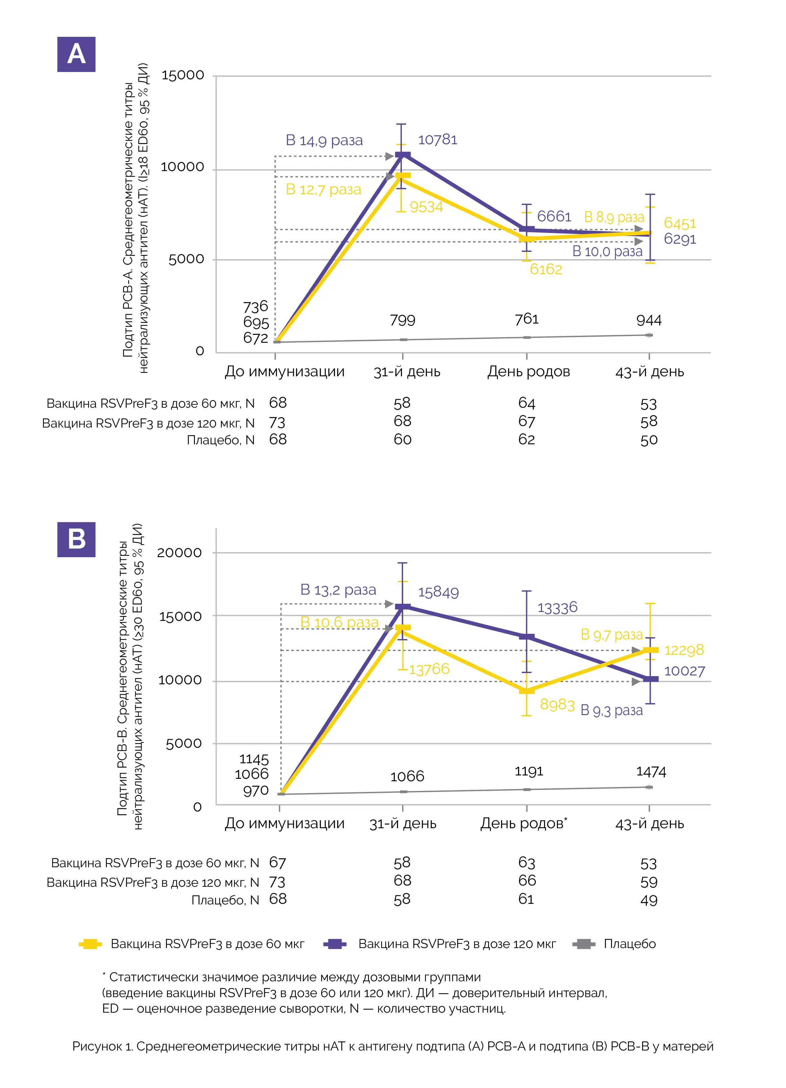 Безопасность иммунизации с введением вакцины RSVPreF3 в дозе 60 или 120 мкг в конце 2-го и 3-м триместре беременности оценивали с участием 213 здоровых беременных в возрасте от 18 до 40 лет. Обследование матерей продолжали в течение 6 месяцев после родов, а их детей — в течение первых нескольких месяцев жизни. Иммуногенность оценивали до 43-го дня после родов у матерей и до 181-го дня после рождения у детей.