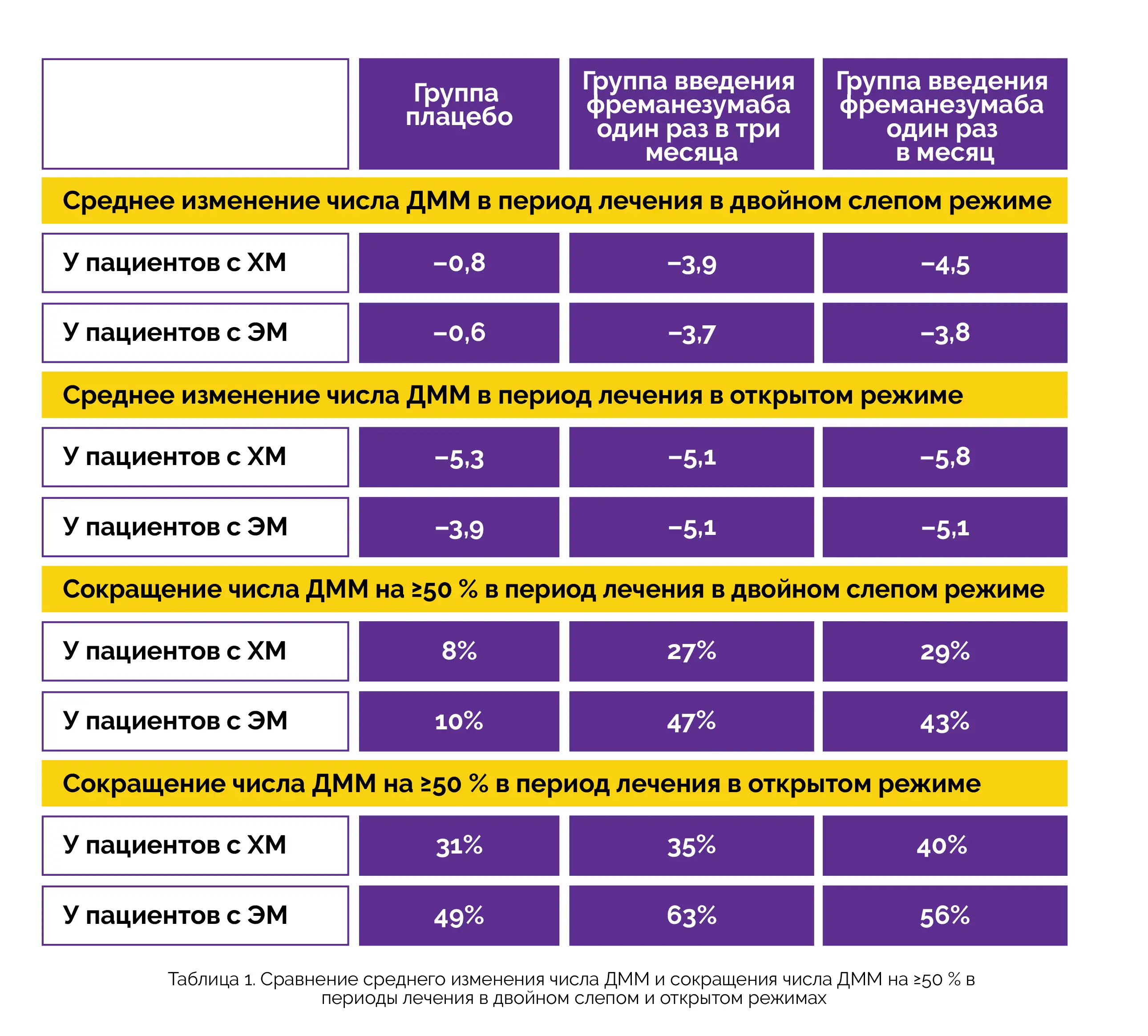 В таблице 1 приведены данные о среднем изменении числа дней с мигренью в месяц (ДММ), рассчитанном по методу наименьших квадратов, в группе плацебо и в группах введения фреманезумаба один раз в месяц или один раз в три месяца у пациентов с ХМ (n = 509) и у пациентов с ЭМ (n = 328), а также данные об изменении среднего числа ДММ у пациентов с ЭМ (n = 313) и у пациентов с ХМ (n = 493) в периоды лечения в двойном слепом и открытом режимах. У лиц с ХМ и ЭМ число дней с головной болью в месяц как минимум средней степени тяжести уменьшилось в период лечения в двойном слепом режиме и увеличилось в период лечения в открытом режиме. В периоды лечения в двойном слепом и открытом режимах сокращение числа ДММ на ≥50 % в группах плацебо, а также в группах введения фреманезумаба один раз в месяц и один раз в три месяца наблюдалось как у пациентов с ХМ, так и у пациентов с ЭМ.