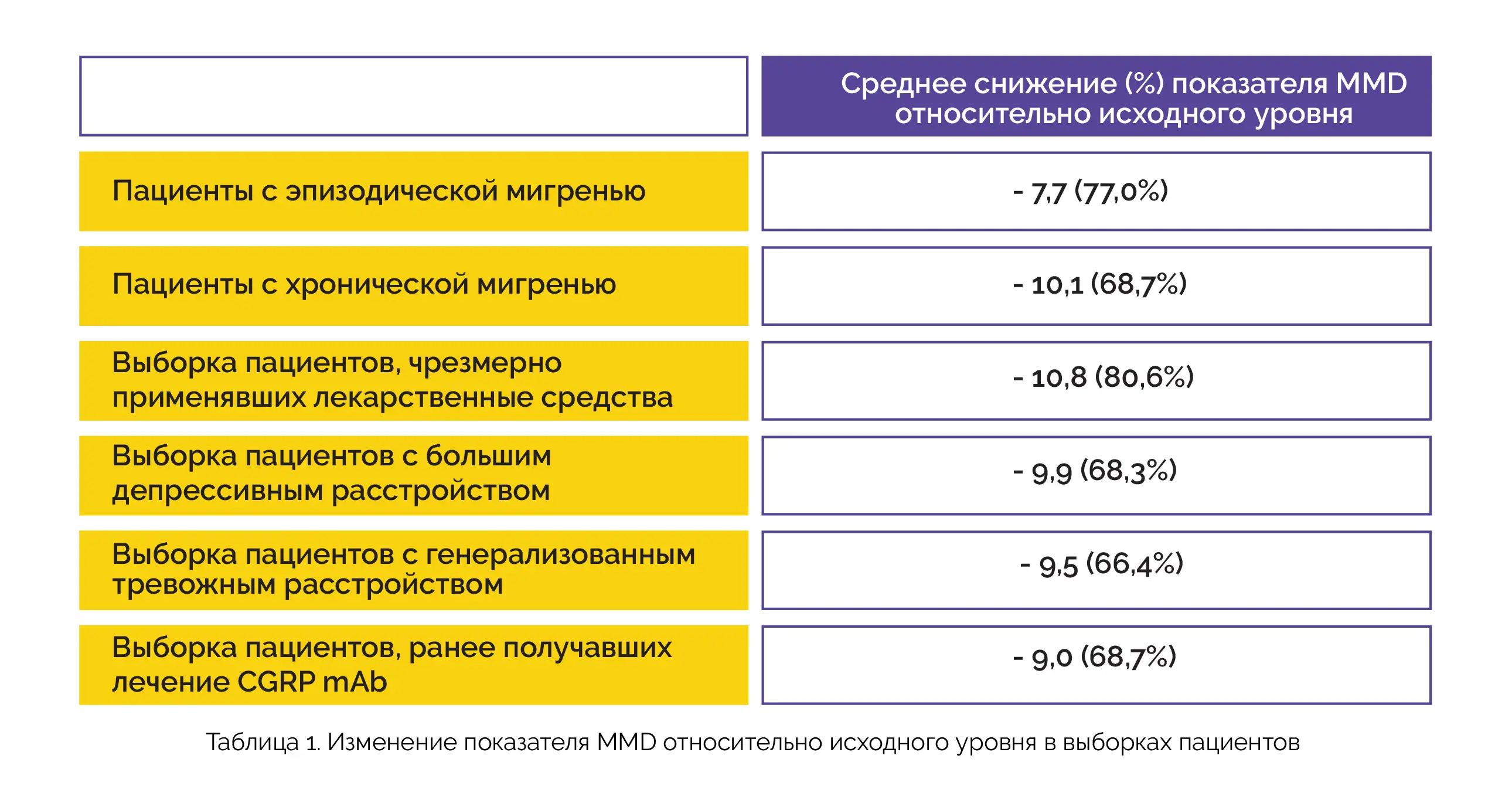 В таблице 1 приведены данные о среднем снижении (%) показателя MMD относительного исходного уровня в выборках пациентов с эпизодической мигренью и хронической мигренью, в выборке пациентов с генерализованным тревожным расстройством, в выборке пациентов, чрезмерно применявших лекарственные средства, в выборке пациентов с большим депрессивным расстройством и в выборке пациентов, ранее получавших лечение CGRP mAb.