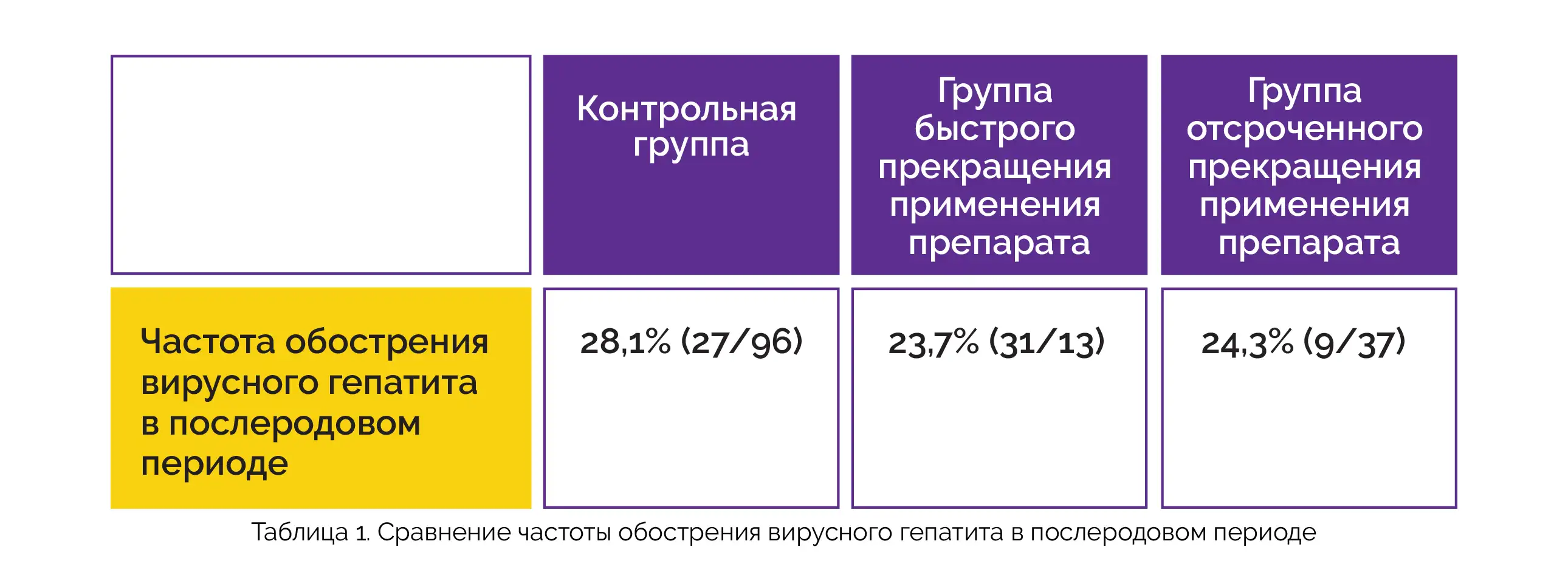 Наблюдение прошли 264 женщины, в том числе 96 женщин из контрольной группы, которые не получали никакого лечения. Из 168 женщин, прошедших лечение, 131 женщина прекратила получение препарата сразу после родов, а еще 37 женщин — через шесть недель после родов. Статистически значимой разницы (χ2 = 0,607) в отношении частоты обострения вирусного гепатита в послеродовом периоде между контрольной группой и группами быстрого и отсроченного прекращения применения препарата выявлено не было (см. таблицу 1).