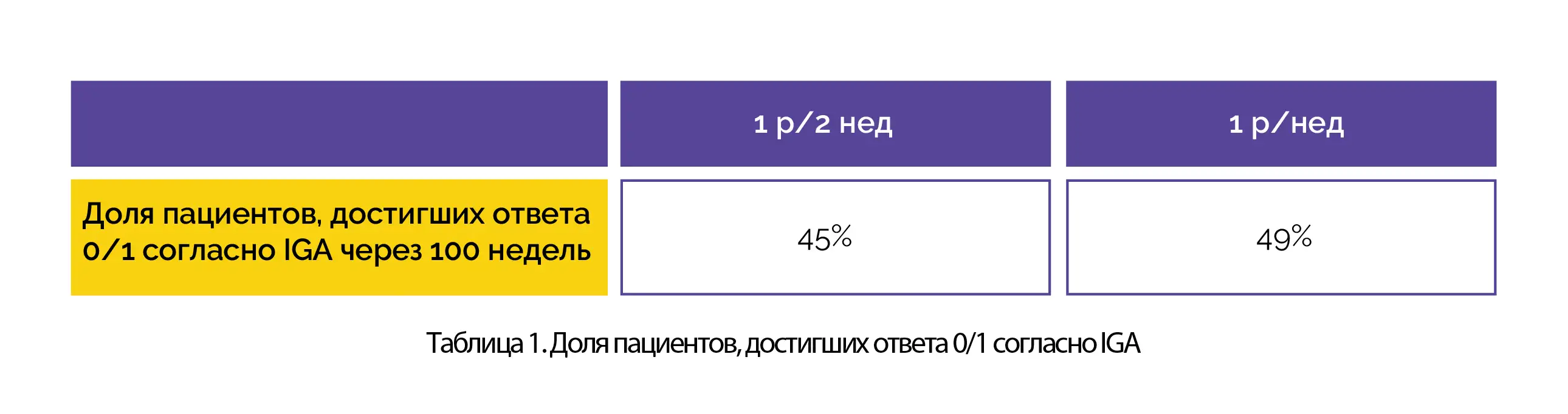 У взрослых пациентов, не достигших ответа 0/1 согласно IGA или EASI 75 за 16 недель в основном исследовании, доля пациентов, достигших EASI 75 через 100 недель, составила 91 %. В таблице 1 приведены данные о доле пациентов, изначально получавших терапию 1 р/2 нед и 1 р/нед и достигших ответа 0/1 согласно IGA через 100 недель.