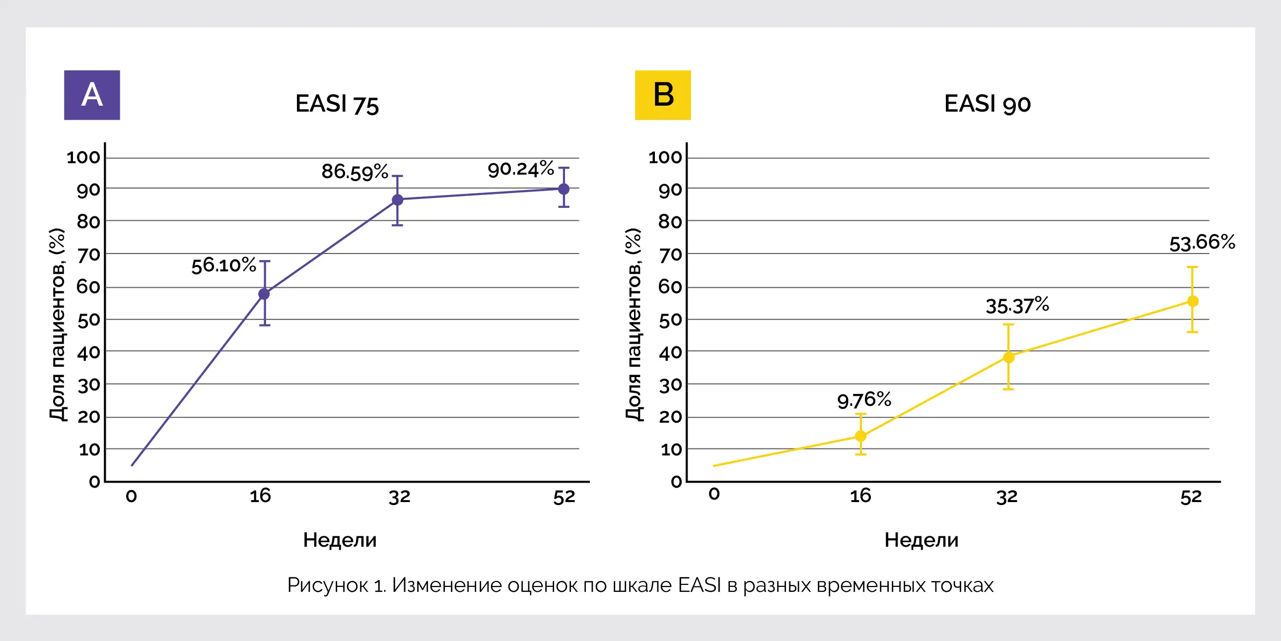 Улучшение показателей на 52-й неделе было более выраженным, чем на 16-й неделе. По сравнению с исходным уровнем отмечалось снижение показателей индекса EASI (88,1 %), оценки максимального зуда по шкале NRS (65,6 %), оценок POEM (67,2 %) и DLQI (69,0 %). Доля пациентов, достигших EASI 75 и 90, приведена на рисунке 1.