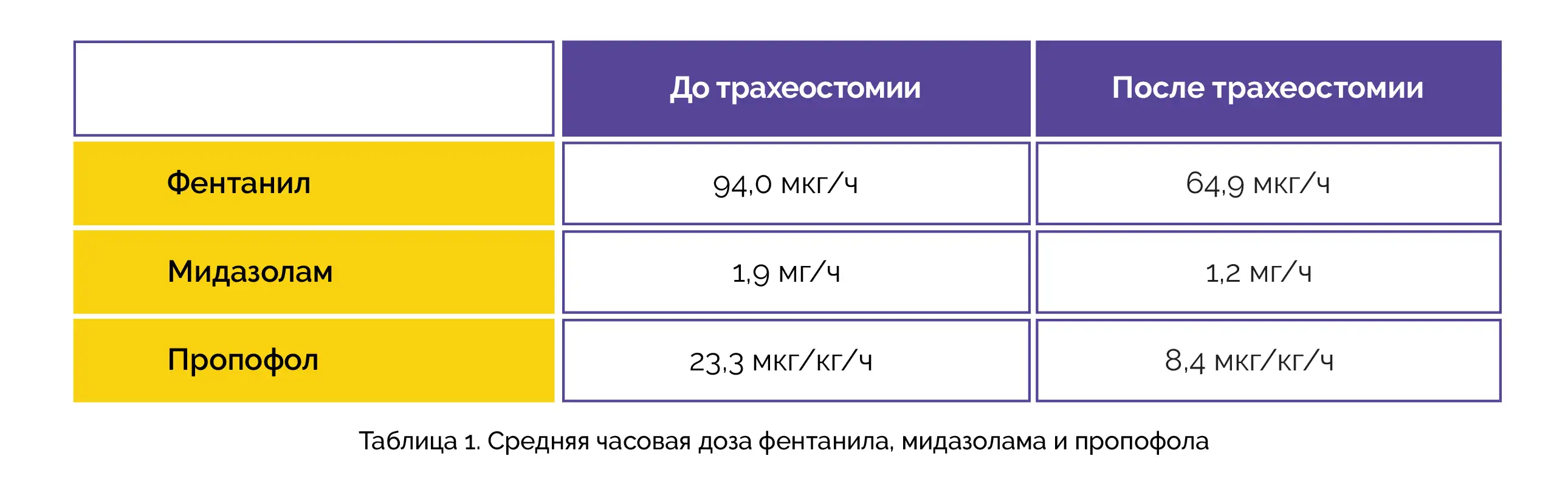 В общей сложности 128 участникам трахеостомия была проведена в среднем через 19,4 дня (после интубации), при этом в 66 % случаев операция была выполнена чрескожно у постели пациента. Через 48 часов после трахеостомии значимо снизилась средняя часовая доза фентанила, мидазолама и пропофола (таблица 1).