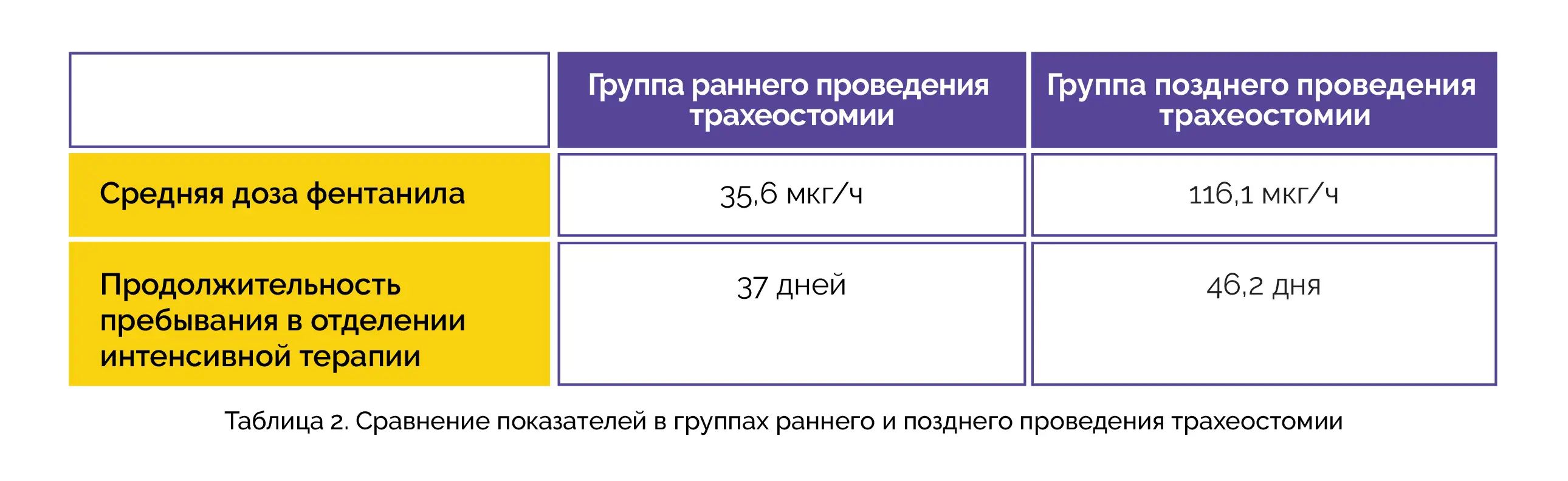 Было отмечено выраженное улучшение оценок по шкале подвижности и шкале комы Глазго в период 48 часов до и после проведения трахеостомии. По сравнению с группой раннего проведения трахеостомии в группе позднего проведения этого вмешательства наблюдалось введение фентанила в значимо более высокой средней дозе в течение 48 часов до трахеостомии. В группе раннего проведения трахеостомии продолжительность пребывания в отделении интенсивной терапии также была меньше (см. таблицу 2).
