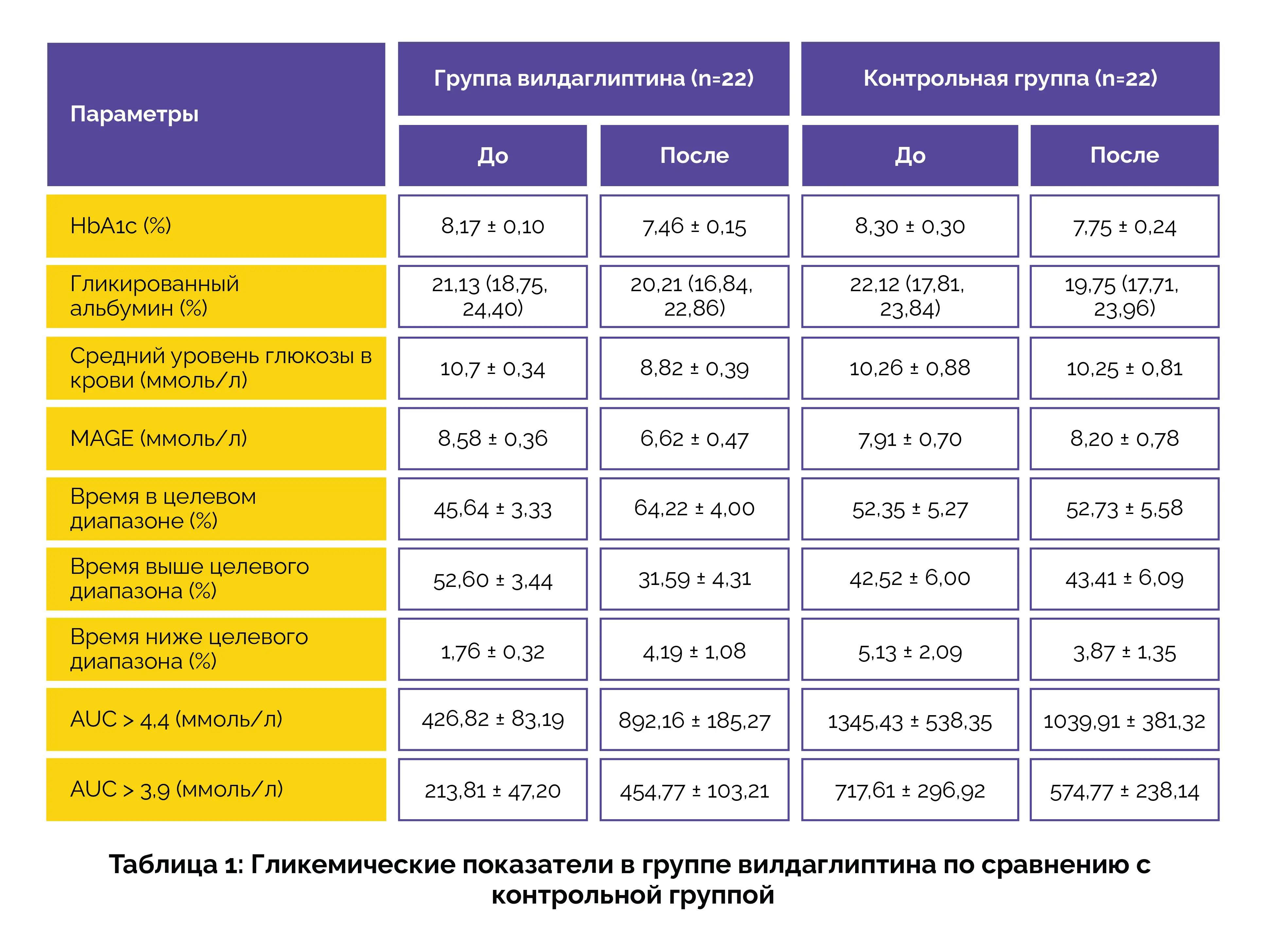 В группе, получавшей вилдаглиптин, наблюдалось значительное снижение уровня HbA1c и гликированного альбумина. Примечательно, что в этой группе наблюдалось значительное снижение средней амплитуды колебаний концентрации глюкозы (MAGE), а также среднего уровня глюкозы в крови и времени превышения целевого диапазона гликемии по сравнению с контрольной группой. Улучшения также наблюдались во времени нахождения в целевом диапазоне гликемии и в площади под кривой (AUC) для концентраций глюкозы выше 4,4 ммоль/л и 3,9 ммоль/л (таблица 1).