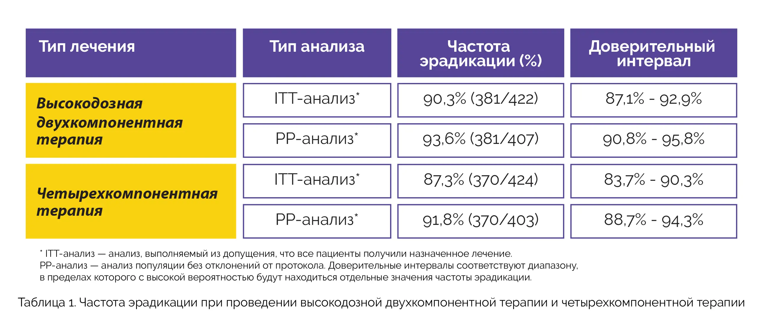 Высокодозная двухкомпонентная терапия обеспечивала сопоставимую частоту эрадикации по сравнению с четырехкомпонентной терапией на основе висмута без статистически значимых различий в частоте нежелательных явлений. Тем не менее двухкомпонентная терапия характеризовалась более высоким уровнем приверженности к лечению.