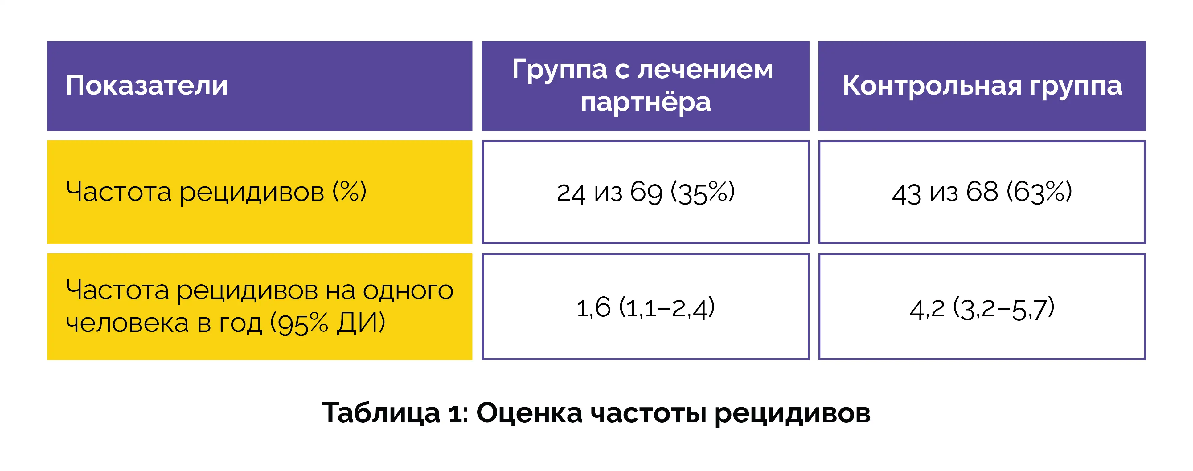 Всего было рандомизировано 164 пары (81 — в группу лечения партнёров, 83 — в контрольную группу). Исследование было досрочно завершено после окончания периода последующего наблюдения у 150 пар, поскольку частота рецидивов оказалась значительно ниже при лечении обоих партнёров. Согласно модифицированному анализу всех пациентов, включенных в исследование, которым было назначено лечение (ITT), частота рецидивов бактериального вагиноза и рецидивов на одного человека в год была ниже в группе с лечением партнёров по сравнению с контрольной группой (абсолютная разность рисков: –2,6 рецидива на человека в год; 95% доверительный интервал [ДИ]: –4,0 до –1,2).