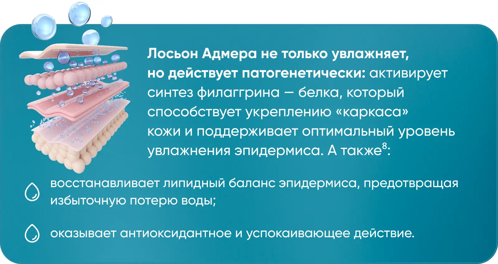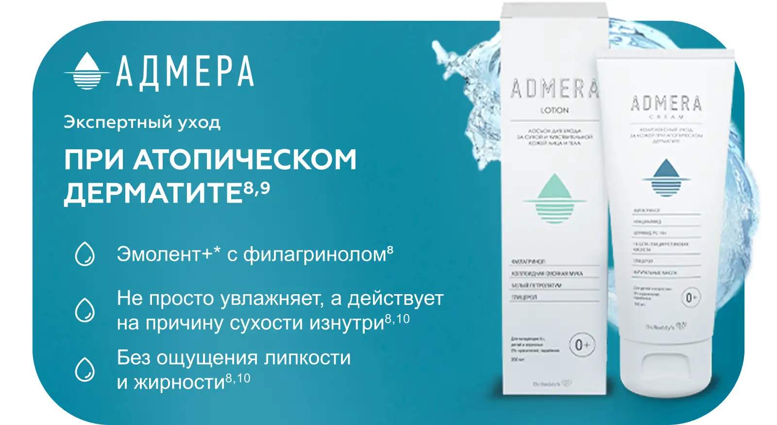 К таким эмолентам относятся, например, крем Адмера (с содержанием филагринола 5%) и лосьон Адмера (филагринол 1%). Если ГКС вместе с кремом Адмера назначают в период обострения атопического дерматита, то лосьон – средство более легкой текстуры, в период ремиссии, а также для сухой, чувствительной кожи.