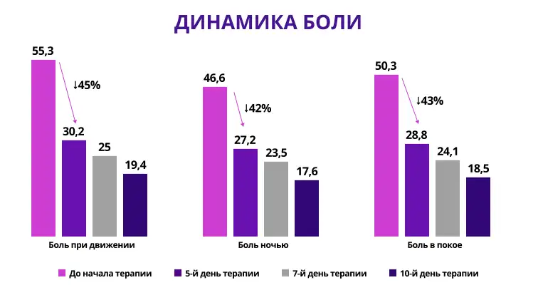 К 7-му дню положительная динамика нарастала: уменьшение боли ≥40% наблюдалось у 63% пациентов (n=38) при движении, у 62% (n=37) — в покое и у 65% (n=39) — ночью.
