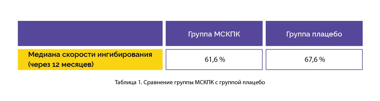 Через 12 месяцев у 17,9 % (10 из 56) пациентов в группе введения МСКПК на КТ больше не наблюдались изменения, при этом пациентов с нормальными результатами КТ в группе плацебо не было. Через 1 год наблюдения различий между группами в отношении развития нежелательных явлений выявлено не было. Через 12 месяцев различий между группами в отношении онкомаркеров не наблюдалось. Результаты всех анализов на нейтрализующие антитела были положительными. Через 12 месяцев в обеих группах наблюдалась аналогичная медиана скорости ингибирования нейтрализующих антител (см. таблицу 1).