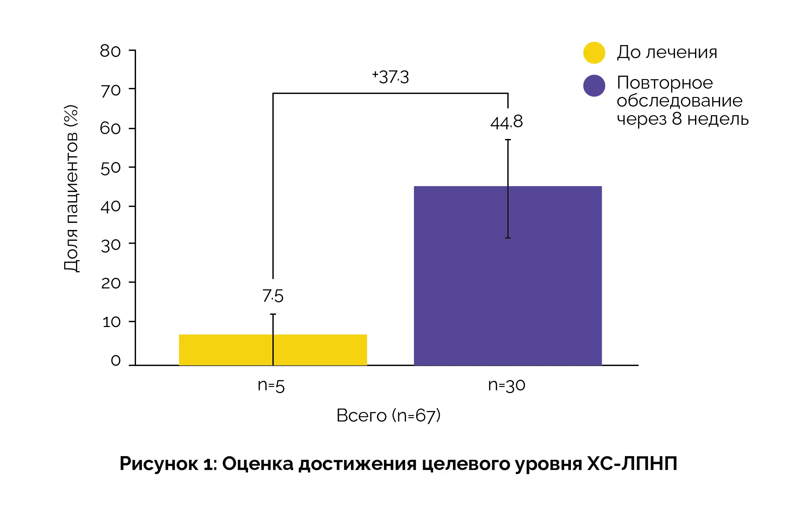 После средней продолжительности лечения 69 дней у пациентов наблюдалось среднее снижение уровня ХС-ЛПНП почти на 30%, с 3,6 ммоль/л до 2,4 ммоль/л на фоне терапии БК или БК+Э ФДК с дополнительными липидснижающими препаратами или без них. Процент пациентов, достигших целевых уровней ХС-ЛПНП, увеличился более чем в 6 раз — с 7,5% на исходном уровне до 44,8% через 8 недель (Рисунок 1).