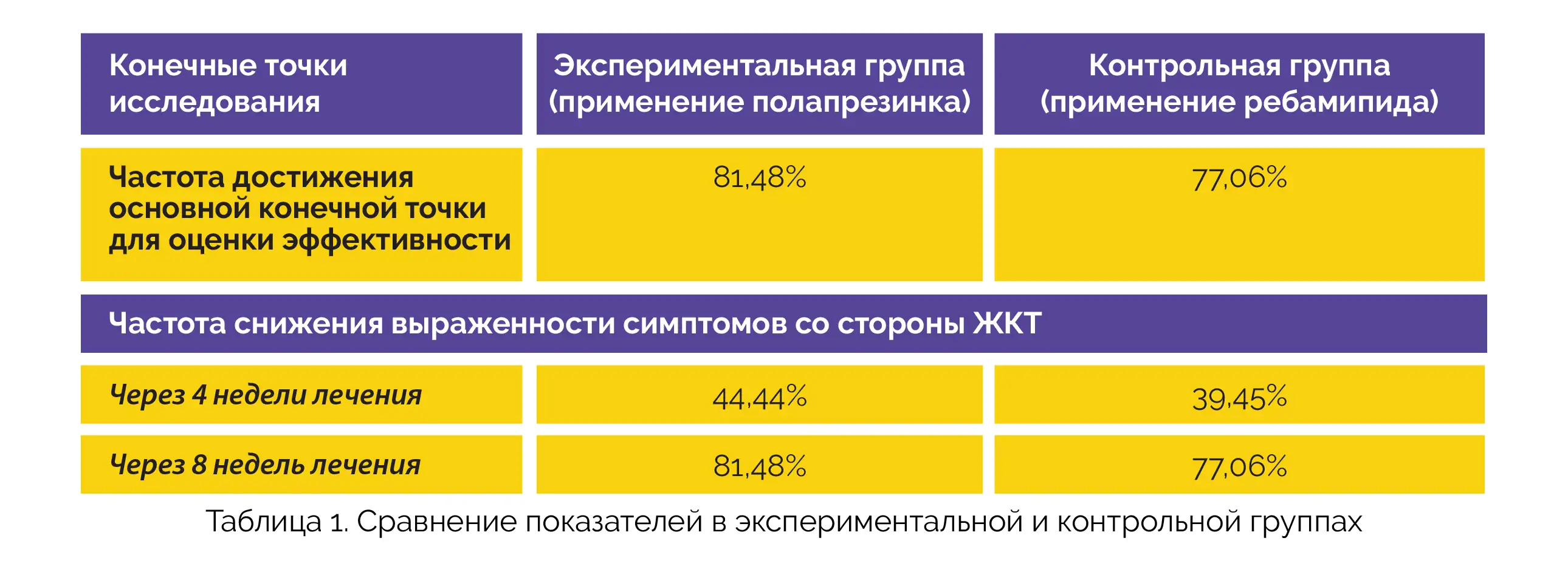 Применение полапрезинка в гранулах обеспечивает сходный терапевтический эффект у пациентов с язвенной болезнью желудка по сравнению с широко назначаемыми препаратами для лечения этого заболевания в клинической практике.