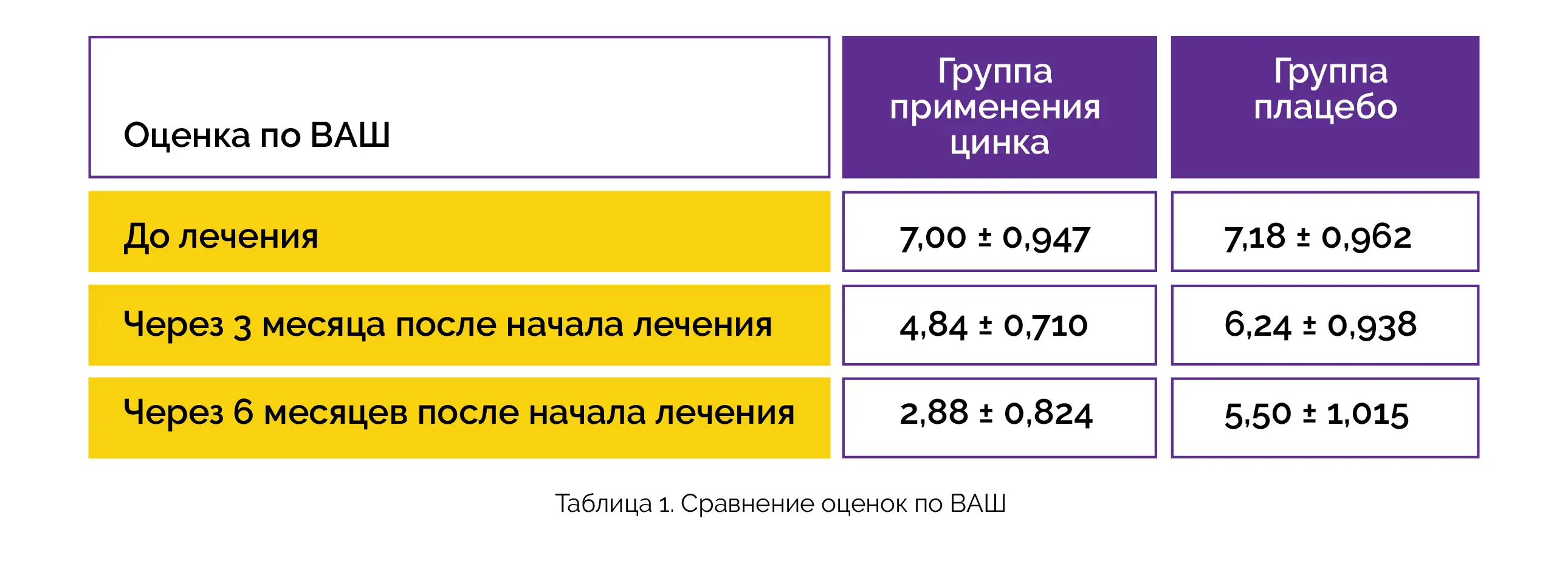 По сравнению с плацебо применение добавок с цинком в течение трех месяцев обеспечивало снижение интенсивности боли, при этом через шесть месяцев интенсивность боли была еще ниже.