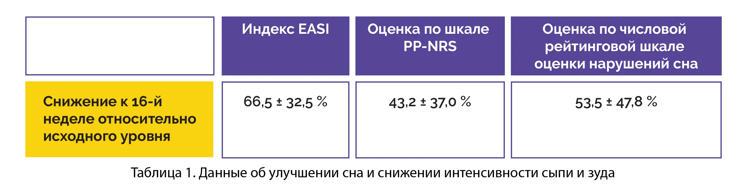Фармакокинетика немолизумаба характеризовалась средним периодом полувыведения 16,7 ± 4,1 дня, линейной элиминацией и абсорбцией первого порядка. В течение периода лечения длительностью 16 недель минимальные значения концентрации находились в диапазоне от 2935 ± 1029 до 3292 ± 2018 нг/мл. У пациентов было отмечено статистически значимое улучшение сна, снижение интенсивности сыпи и зуда, а также снижение к 16-й неделе относительно исходного уровня индекса распространенности и тяжести экземы (EASI) и оценок по PP-NRS и числовой рейтинговой шкале оценки нарушений сна (см. таблицу 1).