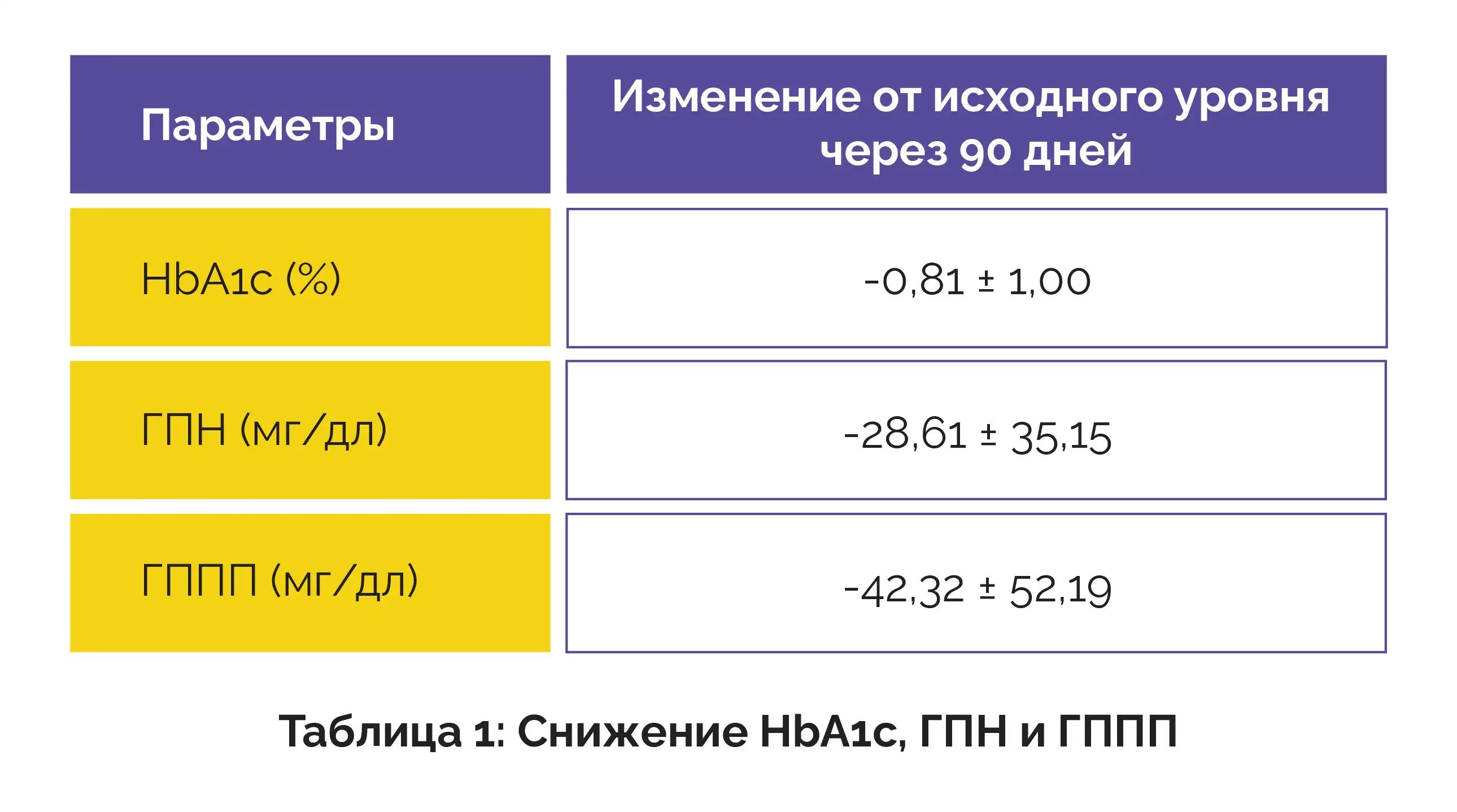 В исследование были включены 1090 пациентов. Средний возраст составил 54,46 года, а средний исходный уровень HbA1c - 8,19 ± 1,22%. Из них 89,26 % получали ФКД вилдаглиптина SR 100 мг и метформина SR 500 мг, а 10,73 % — комбинацию с метформином SR 1000 мг. Через 90 дней наблюдалось существенное снижение HbA1c, ГПН и ГППП по сравнению с исходными значениями (таблица 1):