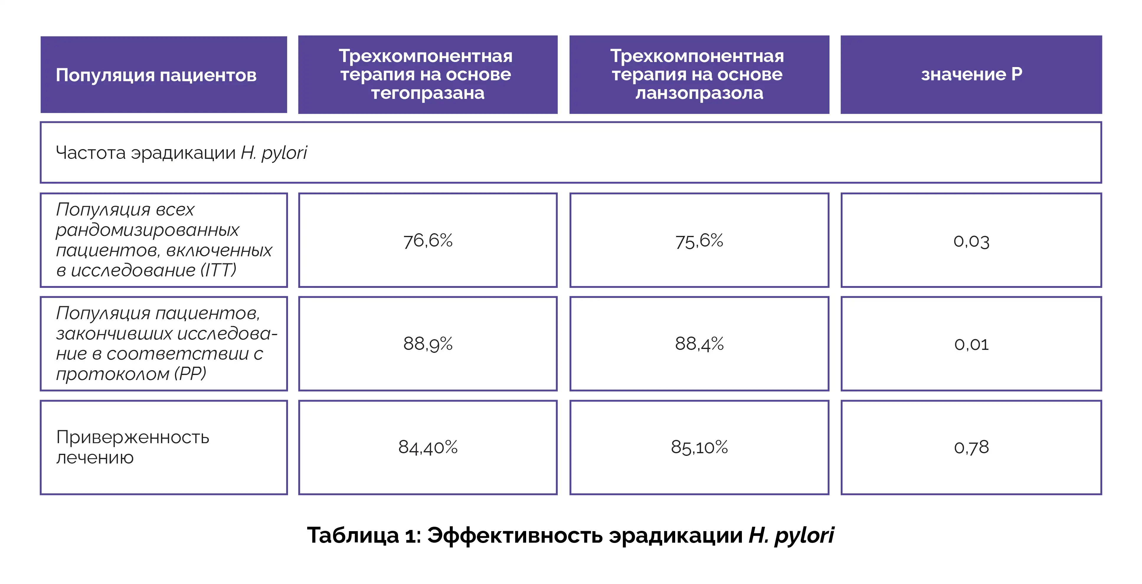 Из 670 пациентов 64 получали трехкомпонентную терапию на основе тегопразана, а 295 получали трехкомпонентную терапию на основе лансопразола в качестве терапии первой линии. Приверженность лечению была сопоставимой между группами. Частота эрадикации H. pylori в анализах ITT и РР представлены в таблице 1: