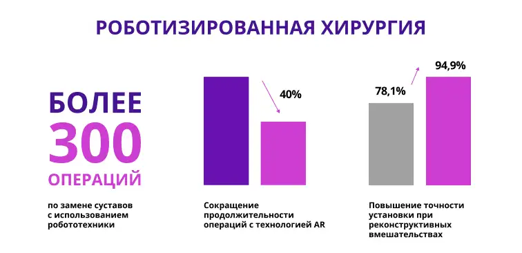 Во всём мире роботизированная хирургия активно развивается, и Россия не исключение. Так, в 2024 году в Городской клинической больнице № 31 имени академика Г.М. Савельевой в Москве проведено более 300 операций по замене суставов с использованием робототехники [2].