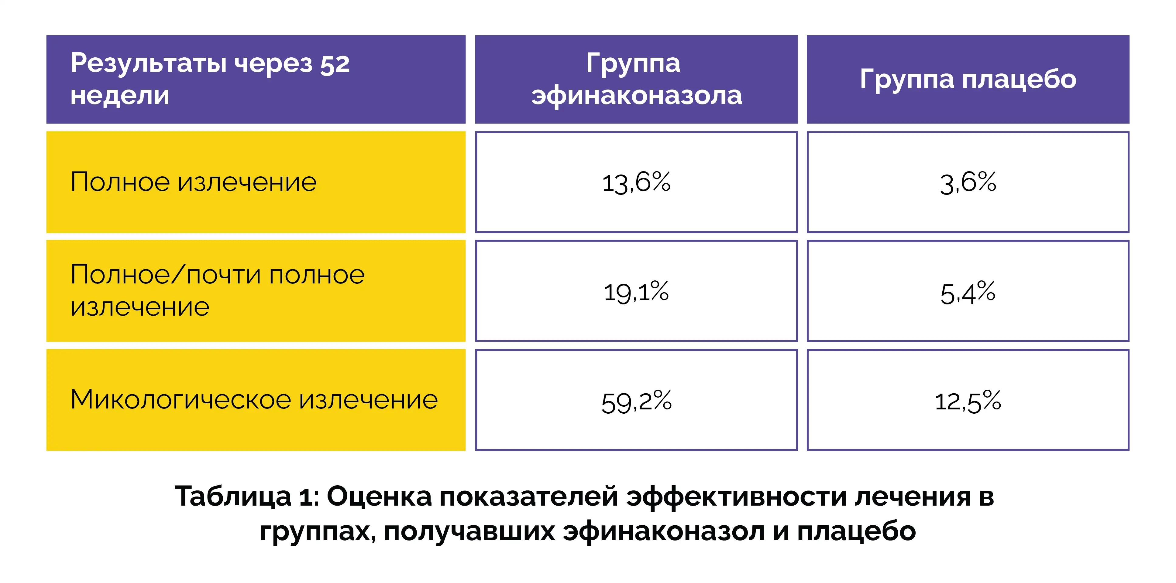 На 52-й неделе у пациентов (в возрасте 65–71 года), получавших лечение эфинаконазолом, наблюдался значительно более высокая частота полного излечения по сравнению с теми, кто получал плацебо. Частота микологического излечения и полного или почти полного излечения (≤5% поражения ногтя и микологическое излечение) также была заметно выше при применении эфинаконазола (таблица 1).