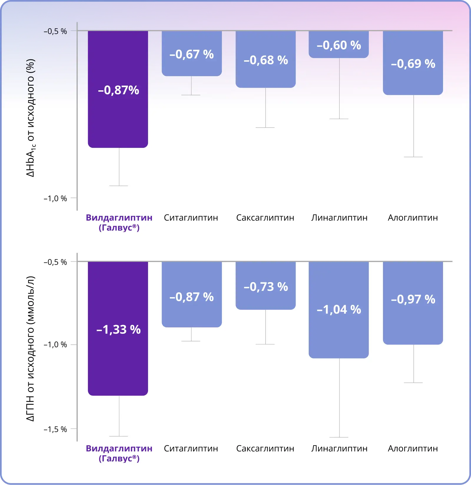 По результатам метаанализа сравнения эффективности инкретин-направленной терапии вилдаглиптин (Галвус®) показал более выраженное снижение HbA1c и ГПН в классе иДПП-4 [1]
